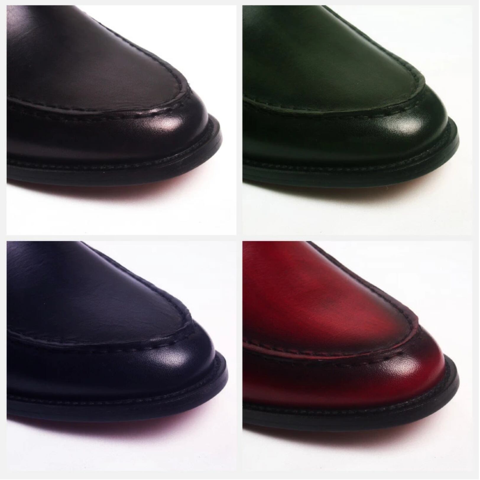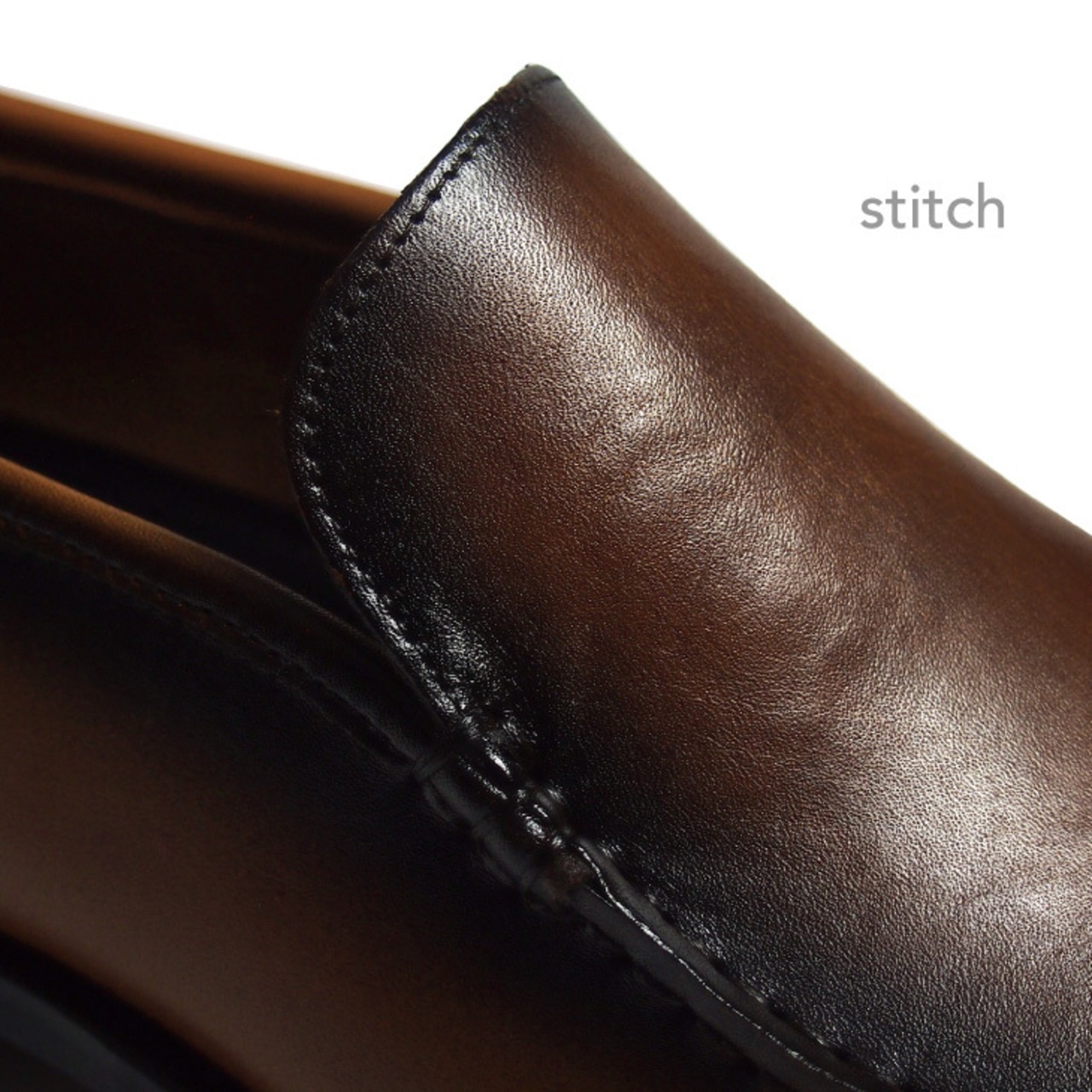 RINYS CROWNのヴァンプローファー パティーヌ レザースリッポンは、カジュアルからスーツスタイルまで幅広いコーディネートにマッチする、万能なメンズローファーです。上品な光沢のあるパティーヌ加工が施されたレザー素材が、高級感を演出します。